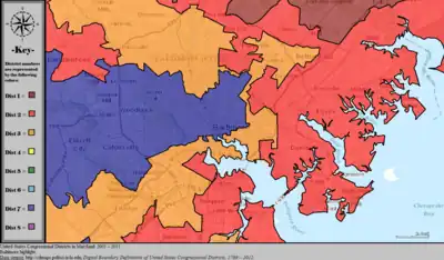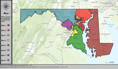 Maryland is divided into eight congressional districts, each represented by a member of the United States House of Representatives. After the 2020 census, the number of Maryland's seats remained unchanged, giving evidence of stable population growth relative to the United States at large.[1][2]