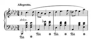 The piece begins with a memorable main theme that Chopin varies from time to time to maintain the piece's interest. The trio section of the piece is very similar to the main theme, providing little contrast.[2] The piece concludes with an interesting coda, full of accidentals and chromatic harmonies and finishing on a tonic chord, repeated 4 times.[3]