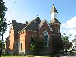Mechanicsburg's Methodist Protestant church was organized on February 13, 1853, following a directive by the denomination's Ohio Conference from the previous September. Under the initial leadership of S.P. Kezerta, the fledgling church had a charter membership of ninety-two individuals.[2]: 600 The national Methodist Protestant Church had been formed by those who dissented from the church government of the Methodist Episcopal Church, objecting to the powers of the church's bishops.[3] Matters were radically different in Mechanicsburg,[4]: 473 which had developed a reputation as a "black abolition hole" among those pursuing the many runaway slaves who passed through the town on the Underground Railroad.[5]: 4 Turmoil in the national church disturbed many members of the Mechanicsburg Methodist Episcopal Church, and Kazerta gathered a congregation of abolitionist families into a new congregation. The members purchased a lot on West Sandusky Street, upon which a two-story brick church was constructed in 1858.[4]: 474 Mechanicsburg's Masonic lodge assisted in construction, and in return they were sold rights to the second story. In its early years, the congregation was weakened by members' departures to other communities or by death, and it was attached to another young congregation in Catawba until 1865.[2]: 600 As the years passed, the church grew stronger; membership reached 308 in 1879, at which time the building was remodelled and refurbished, and by 1890 a new building was needed. After concluding the lease with the Masons, the congregation destroyed the old building and erected a new structure on the same lot, and all debts were paid by the end of 1891. It was further strengthened by donations from two members: one gave his home for use as a parsonage, and the other endowed the church's Sunday school. By 1917, the membership had surpassed five hundred.[2]: 474 In 1939, the Methodist Protestant Church merged back into the Methodist Episcopal Church, producing The Methodist Church,[6] and the two local congregations subsequently rejoined as well. After the merger, the property was sold to a local Baptist congregation.[7]