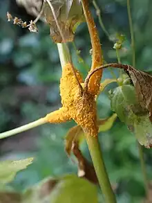 Melampsora pulcherrima is a Mediterranean plant pathogen. It is a rust that infects Mercurialis annua,[1] causing galls, pycnia, and aecia over leaves and stem in winter, seen as a golden yellow swelling over several centimeters, as well as Populus alba, causing uredia and telia[2] on leaves from spring until autumn.
