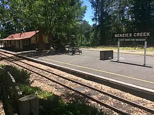 These days, Menzies Creek has an island crossing platform with a track on each side, a loop siding and also a siding into the museum. The station now is home to the "Aura Tearooms", the Puffing Billy Narrow Gauge Museum, and also boasts a Signal bay containing a 14-lever interlocking frame.
