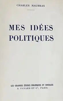Mes idées politiques (My political ideas) is an anthology of articles written by the journalist and French politician Charles Maurras, director of Action Française, and was published in 1937. The book was composed during the author's detention in La Santé Prison from October 29, 1936 to July 6, 1937 for death threats against Léon Blum. The text was compiled by Pierre Chardon, pseudonym of Rachel Legras, former mistress of Maurras in the 1910s. Legras began to compile several articles of Maurras's articles in order to synthesize his thought.[1] According to the specialist Stéphane Giocanti, it is a "true scrapbook of Maurras's political ideas".[2]
