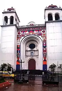 The festive and colorful facade surrounds a shrine to an image of the Divine Saviour of the World (Jesus, after the Transfiguration, the patron of El Salvador) sculpted by Friar Francisco Silvestre García in 1777.[1] The main altar features an image of the Divine Saviour donated by the Holy Roman Emperor Charles V in 1546. The image rests on a four-column baldacchino surrounded by images of the prophets Moses and Elijah, who take part in the Transfiguration story. The main altar is surrounded by eight large paintings showing scenes from the life of Christ painted by Andrés García Ibáñez.[1] Above it all, the bright Churrigueresque cupola stands 148 feet in height, with a 79-foot radius.[1]