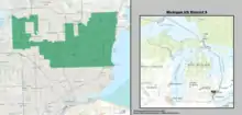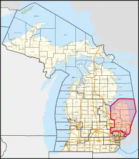 Michigan's 9th congressional district is a United States congressional district located in The Thumb and northern portions of Metro Detroit of the State of Michigan. Counties either wholly or partially located within the district include: Huron, Tuscola, Sanilac, Lapeer, St. Clair, Macomb and Oakland. With a Cook Partisan Voting Index rating of R+18, it is the most Republican district in Michigan.[2]