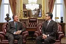 On October 26, Johnson met with Prime Minister Anthony Albanese of Australia during the latter's state visit to the United States.[78] Later that day, he also met with President Joe Biden for the first time as speaker before attending a bipartisan briefing held at the White House on the administration's proposed funding requests for aid to Ukraine and Israel.[79] On October 30, Johnson suggested rescinding IRS funding from the Inflation Reduction Act to provide Israel $14.3 billion in aid.[80]