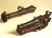 Miniature meriam kecil (also known as currency cannon) is a type of very small cannon found on the Indonesian archipelago. Usually the length of these cannons is between 10–60 cm (3.9–23.6 in), with a caliber of 15 mm (0.59 in) or 16 mm (0.63 in),[1] and has been around for hundreds of years. They are designed and decorated like a normal sized meriam kecil (lela or rentaka).[2]