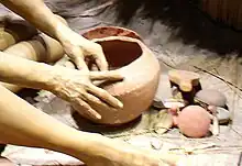 Most pottery found at Mississippian sites is of the variety known as "Mississippian Bell Plain." It is buff colored, contains large fragments of ground mussel shell as a tempering agent, and is not as smooth and polished as finer varieties. Higher quality ceramics feature a finer ground shell as a temper – some instances being so finely ground as to look untempered.[5] Extravagant fine serving wares and grave goods were also produced, with some examples exhibiting handles shaped like animal heads and tails, or in the shapes of animal or human forms.[6] Women were probably the makers of pottery, as they were in most other Native American cultures. Archaeologists found 11 polishing pebbles and a mushroom-shaped pottery anvil in the grave of a woman at the Nodena site.[5]
