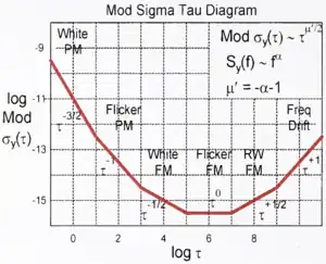 The modified Allan variance (MVAR),[2] also known as mod σy2(τ), is a variable bandwidth modified variant of Allan variance, a measurement of frequency stability in clocks, oscillators and amplifiers. Its main advantage relative to Allan variance is its ability to separate white phase noise from flicker phase noise.