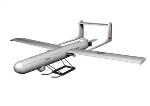 The Mohajer-3, also known as the Dorna, was designed with a new airframe for better performance.[17] It had a square body and featured a low-mounted horizontal stabilizer flush with the main wing, the only member of the Mohajer family configured this way.[17] The Mohajer-3 could be fitted with fixed landing gear, for a runway takeoff, or with skids for a JATO launch.[17] It was recovered by parachute or skid landing.[17] It was powered by an unidentified 25 hp (18.6 kW) piston engine.[2] The Mohajer-3 was announced in 1999.