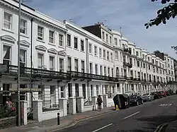 The "heavy Italianate detailing" of the large four-storey bay-fronted houses on the east side identifies them as 1860s buildings. There are prominent cornices and pairs of porches whose style is reminiscent of the work of 18th-century architect James Gibbs, and some houses are also linked by iron balconies on the top floor (a balcony runs along the whole length of the terrace at first-floor level). "Cheery" red-brick Edwardian houses face the terrace.[6][58]
