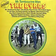 Mr. Tambourine Man is the debut studio album by the American rock band the Byrds and was released on June 21, 1965, by Columbia Records.[1] The album is characterized by the Byrds' signature sound of Jim McGuinn's[nb 2] 12-string Rickenbacker guitar and the band's complex harmony singing.[2] The material on the album mostly consists of cover versions of folk songs, primarily composed by Bob Dylan, and originals written or co-written by singer Gene Clark.[3] Along with the Dylan-penned single of the same name, Mr. Tambourine Man established the band as an internationally successful act[4] and is widely regarded by critics as representing the first effective American challenge to the chart dominance of the Beatles and other British Invasion bands during the mid-1960s.[3][5]