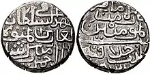 He succeeded his father, Khizr Khan to the throne in 1421. Born "Mubarak Khan", he took up the regnal name of Muizz-ud-Din Mubarak Shah or simply Mubarak Shah. The Sayyids were subservient to Timur's successor, Shah Rukh, and while Khizr Khan did not assume the title of sultan, Mubarak Shah was acknowledged as one and However, it is also known that Mubarak Shah received a robe and a chatr (a ceremonial parasol) from the Timurid capital of Herat which indicates that the fealty continued in his time. During his reign, Mubarak Shah had to deal with the rise of local dynasties in the aftermath of the Timurid invasion of India. However, the biggest threat to his power was that of Jasrat, a Muslim chieftain from Punjab who had conquered vast territories from Delhi sultanate and even aimed for Delhi in 1431. However, Jasrat retreated once Mubarak Shah marched with a large army against him.[1] Two years after this great victory however, Mubarak Shah was murdered in 1434 and succeeded by his nephew, Muhammad Shah.[2][3]
