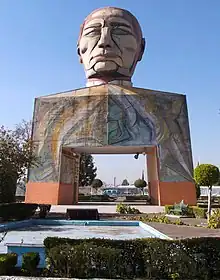 Luis Echeverría ordered the erection of a monument to Benito Juárez in 1972.[1] The selected space was a roundabout along Guelatao Avenue[lower-alpha 1] in Iztapalapa, Mexico City.[3] Architects Lorenzo Carrasco Ortiz and Miguel Ramírez Bautista designed the civil work.[1] Meanwhile, David Alfaro Siqueiros was hired to paint murals on the walls, but his health began to deteriorate and he died in 1974.[4] Luis Arenal Bastar, Siqueiros's brother-in-law, replaced him and additionally sculpted the colossal head with help of Carrasco Ortiz.[1][5]