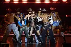 Photo sessions for Music were conducted by Jean Baptiste Mondino, who had worked previously with the singer on a number of photoshoots and music videos.[58] The art direction and design were done by Kevin Reagan.[30] The artwork depicted Madonna as a cowgirl, wearing pink and blue stetsons and embroidered jeans, among hay bales and 1950s cars.[58] The images and typographical style paid homage to the iconography of the western United States, relishing Americana culture while at the same time satirizing it.[58][59] Mondino had the idea of the western themes for the album; Madonna was not sure at first, but was convinced by the photographer and eventually appreciated the final result.[60] Santiago Fouz-Hernández, author of Madonna's Drowned Worlds: New Approaches to Her Subcultural Transformations, described the visual as "a complete celebration of camp", which was highlighted by Madonna's combination of western clothing with expensive shoes such as bright red high heels.[61][62] He also thought it was inspired by Miss Rodeo America and the photo book Rodeo Girl (2000) by Lisa Eisner, and also defined it as an evocation of Judy Garland.[59][62] Madonna also used her cowgirl style during her public appearances to promote the album, including jeans, shirts and cowboy hats,[63] and eventually became one of her most recognized reinventions.[64][65]