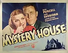 Mystery House is a 1938 American mystery crime film directed by Noel M. Smith and starring Dick Purcell and Ann Sheridan as nurse Sarah Keate, and is based on the 1930 novel The Mystery of Hunting's End by Mignon G. Eberhart. Sheridan also played the same character in The Patient in Room 18, released in January 1938, while Aline MacMahon played her in While the Patient Slept in 1935.