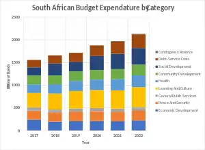 The National Budget of South Africa comprises the spending and revenues of the Government of South Africa.[1][2][3] The budget is the financial representation of the priorities of the government,[4][5][6][7][8][9] reflecting historical economic decisions and competing economic policy's.[10][11][12]