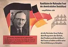 The National Front of the German Democratic Republic (German: Nationale Front der Deutschen Demokratischen Republik) was officially an alliance of parties and mass organisations (1950–1990). In fact, only one party held power in the GDR, namely the communist SED. The National Front was an instrument to exercise control over the other parties and organisations. The precursor of the National Front was the Democratic Bloc (since 1945).
