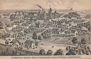 The leading civilian organization was the United States Sanitary Commission; it secured permission from President Lincoln in the summer of 1861 to deliver medical supplies to the battle front, build field hospitals staffed with volunteer nurses (mostly women), and raise funds to support the commission's programs.[6] As the war continued, civilian leaders began to address the issue of caring for the numerous veterans who would require assistance once the war ended. Members of the Sanitary Commission favored the pension system rather than permanent institutional care for the disabled veteran; the commission feared that a permanent institution would become a poorhouse for veterans.[7] Other groups favored as strongly the establishment of a soldiers' asylum, to ensure provision of quality care. The groups gathered information on European military asylums, particularly the Invalides in Paris. They tended to find evidence to support their opinions on either side of the concept of a soldiers' asylum.[8]
