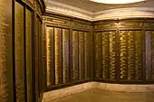 Within the memorial the architects added an inner shrine, or Record Room, in which could be recorded the names of the South Australians who fell during the war. Although the design did not specify the exact form that this would take,[54] in the completed memorial these names are inscribed in the bronzes that line the walls.[1]