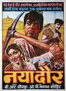 Naya Daur (transl. The New Era) is a 1957 Indian Hindi-language social drama film directed and produced by B. R. Chopra. It was written by Akhtar Mirza. It stars Dilip Kumar, Vyjayanthimala in lead roles, along with Ajit, Jeevan, Johnny Walker, Chand Usmani, Nazir Hussain, Manmohan Krishna, Leela Chitnis, Pratima Devi, Daisy Irani, Radhakishan form an ensemble cast. The film narrates the story of Shankar and Krishna, two best friends who fall for the same woman, Rajni.