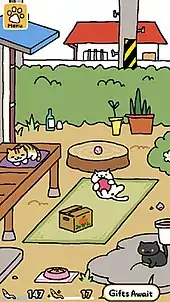 In version 1.5.5, there is a chance that the player's yard will be covered in snow.[15] The snow event typically lasts for 24 hours and changes the appearance of the yard as well as the background music. The player also has the opportunity to get a new rare cat, Frosty. Version 1.6.0 was released on March 24, 2016. This version added two new common cats and two new rare cats, more toys, and introduced the "gallery" where players can buy wallpapers for their phones with gold fish.[16] Version 1.7.0 was released on July 14, 2016. This version added three more cats (two common and one rare), more toys, and more wallpapers. Version 1.8.0 was released on October 13, 2016. This version added two new common cats, more toys, and a new remodel. Version 1.9.0 was released on December 15, 2016. This version added new toys, one rare cat, and enabled snow days like version 1.5.5.[17] Version 1.10.0 was released on July 20, 2017. This version added two new common cats, a rare cat, and more toys. Version 1.11.0 was released on December 22, 2017. This version added one new common cat and more toys.