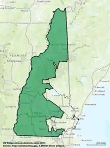 New Hampshire's 2nd congressional district covers the western, northern, and some southern parts of New Hampshire. It includes the state's second-largest city, Nashua, as well as the state capital, Concord. It is currently represented in the United States House of Representatives by Democrat Ann McLane Kuster.