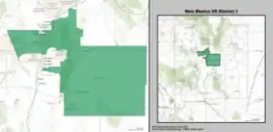 New Mexico's 1st congressional district of the United States House of Representatives serves the central area of New Mexico, including most of Bernalillo County, all of Torrance County, and parts of Sandoval, Santa Fe and Valencia counties. It includes almost three-fourths of Albuquerque. The district has a notable Native American presence, encompassing several pueblos including the Pueblo of Laguna and Sandia Pueblo, and the Tohajiilee Navajo Reservation outside Albuquerque.[4] The seat is currently represented by Democrat Melanie Stansbury. With a Cook Partisan Voting Index rating of D+5, it is the most Democratic district in New Mexico, a state with an all-Democratic congressional delegation.[3]