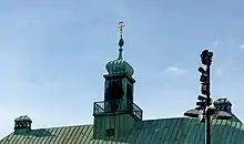 The main façade on the eastern side overlooking the cathedral consists of five two-sectioned windows with a narrow window band on either side. The hipped roof is structured with seven dormers. In the middle of the roof, there is a small ridge turret crowned by a Fortuna sculpted in gilt bronze and designed by Georg Roemer.