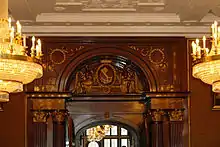 At the end of the Upper Lobby, the Senate Chamber (Senatssaal) is used for the sessions of the Senate of Bremen. The carpets were designed by the then young artist and writer Rudolf Alexander Schröder in his capacity as interior decorator. In 2012, Schröder's carpet was replaced by an exact replica, 160 m2 (1,700 sq ft) in size. Produced in Nepal, the replacement cost €110,000.[4]