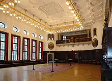 The Great Hall (Festsaal) is used for large receptions and presentations. From 17 March 1946 until 1966, it was home to the Bremische Bürgerschaft, the parliament of the State and City of Bremen. In the corners, there are paintings of the town gates and fortifications (Ansgaritor, Braut, Zwinger and Hohentor) by F. Jakobsen. A painting by Carl Vinnen depicts Bremen in the 17th century. Two coats-of-arms symbolise a historic partnership with the two Hanseatic cities Lübeck and Hamburg. In 1993/94, the light fixtures on the ceiling which had been lost in the war were reconstructed.