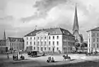 Between 1819 and 1908, the building known as the Stadthaus supplemented the Town Hall in fulfilling the administrative requirements of the city. It had been built on the site of the Palatium, the archbishop's residence. The Stadthaus was a fairly simple building in the Neo-classical style. It consisted of offices and storage rooms for the municipal administration. In 1818, Bremen had 37,029 inhabitants but by 1904, the population had grown to 206,928. The rather modest building failed to meet the evolving requirements of the city. It lacked office space and was not sufficiently representative of the city's prosperity.