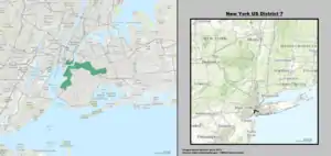Like many Congressional districts around the country, the New York Seventh's boundaries were drawn as to link disparate and widely separated neighborhoods with a large percentage of minority voters (see majority-minority districts). While no minority in the district constitutes an absolute majority, the boundaries group together heavily Puerto Rican neighborhoods in the New York City boroughs of Brooklyn and Queens.
