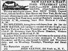 On April 4, 1836,[7] New York commenced a daily passenger-and-mail service from New York to New Haven, replacing the company's steamboat Splendid, which went into reserve. New York initially ran as a passenger-only service, six days a week, while her stablemate, the steamer New Haven, operated a freight service on the same route three days a week. Not long after New York's introduction however, the Post Office insisted upon a seven-day-a-week service, which was duly implemented in spite of company protests. At this time, the passenger fare from New York to New Haven was $2 (equivalent to $53 in 2022). New York and New Haven were to maintain this busy and well patronized service for the next three years.[4]