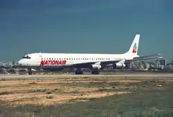 Nigeria Airways Flight 2120 was a chartered passenger flight from Jeddah, Saudi Arabia, to Sokoto, Nigeria, on 11 July 1991, which caught fire shortly after takeoff from King Abdulaziz International Airport and crashed while attempting to return for an emergency landing, killing all 247 passengers and 14 crew members on board.[1][2] The investigation traced the fire to underinflated tires which overheated and burst during takeoff, and subsequently discovered that a project manager had prevented those tires from being replaced because the aircraft was behind schedule. The aircraft was a Douglas DC-8 operated by Nationair Canada for Nigeria Airways. Flight 2120 is the deadliest accident involving a DC-8 and remains the deadliest aviation disaster involving a Canadian airline.[3]