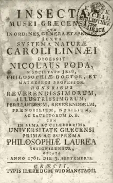 Alongside his time as an entomologist, Nikolaus Poda von Neuhaus, also referred to as "Poda", served as a Jesuit priest as well as a mineralogist.[4] Before working as a mathematics professor in Linz, Austria as well as Graz, Austria he joined the Jesuits in 1740.[2] While serving as a professor of mathematics at the Jesuiten University of Graz, he facilitated the opening of the natural history museum of Austria, now called Universalmuseum Joanneum.[2][5] In addition to his contribution to the Museum of Natural History, he took on the role of director of the Graz Observatory where he worked until 1760.[2]