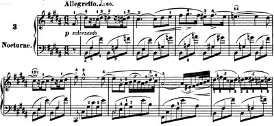 The A and B sections become increasingly ornamented with each recurrence. The penultimate bar utilizes considerable rhythmic freedom, indicated by the instruction, senza tempo (without tempo). The nocturne opens with a legato melody, mostly played piano (quietly), containing graceful upward leaps which becomes increasingly wide as the line unfolds. This melody is heard again three times during the piece. With each repetition, it is varied by ever more elaborate decorative tones and trills. The nocturne also includes a subordinate melody, which is played with rubato.