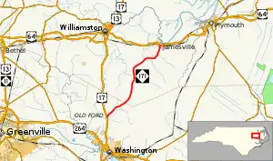 Starting from US 17, in Old Ford, this two-lane rural highway travels through the farmland of Beaufort and Martin Counties, ending in downtown Jamesville at US 64 Business.[1]