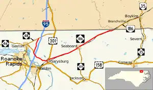 North Carolina Highway 186 (NC 186) is a primary state highway in the U.S. state of North Carolina. Entirely in Northampton County, it helps facilitate truck traffic parallel to I-95 and connects the communities of Seaboard and Margarettsville.