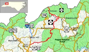 North Carolina Highway 197 (NC 197) is a South-to-North state highway in Western North Carolina. The route is approximately 58 miles (93 km) in length and with its continuation into Tennessee as SR 395 connects Erwin, Tennessee to Flat Creek, North Carolina.[3] Portions of this highway lie within the Pisgah National Forest and is one of the few highways in the state with an unpaved portion.