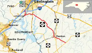 The current NC 47 was established in 1972 as a new primary routing between NC 8 to NC 109, in Denton; this was an upgrade of a combination of several secondary roads.[2] In 1974, NC 47 was extended east, as a new primary routing, to its current eastern terminus with NC 49. In 1981, NC 47 was extended west on new primary routing, through Linwood, to I-85/US 29/US 52/US 70 (exit 86).[3] In 1993, NC 47 was rerouted north from Linwood to I-85 (exit 88); its former alignment becoming Belmont Road (SR 3159).[4] In 2013, NC 47 was extended north to its current western terminus with I-85 Business/US 29/US 52/US 70 (exit 84).[5] In December 2018, NC 47 was adjusted at its western terminus from the northbound I-285 exit/entrance ramps to a continuation along Hargave Lane (at Aviation Way) to the overpass bridge at I-285.[6]