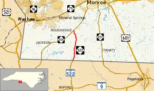 North Carolina Highway 522 (NC 522) is a primary state highway in the U.S. state of North Carolina. The highway runs north–south from the South Carolina state line, near Sapps Crossroads to NC 200 in Roughedge, entirely in Union County.