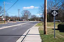 NC 84 begins at an intersection with NC 16 (Providence Road) in Weddington, carrying the name Weddington Road. It carries two undivided lanes of traffic eastward, with a 35 miles per hour (56 km/h) speed limit before leaving town. Immediately after its western terminus is a roundabout with Weddington–Matthews Road. The route also passes by Weddington's town hall. The route then enters wooded land, serving mostly homes along its route with a few open fields along the way. The route then passes through Wesley Chapel, where it serves a shopping area (at the Waxhaw Indian Trail Road intersection) and passes between several residential subdivisions. As it nears Monroe, it connects with NC 200 (Martin Luther King Jr. Boulevard), where it ends.[1]