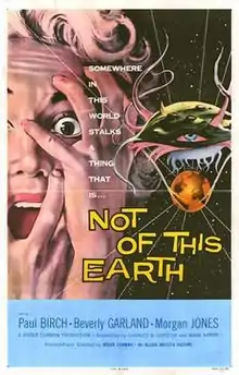 Not of This Earth is an independently made 1957 American black-and-white science fiction film produced and directed by Roger Corman (for his Los Altos Productions), that stars Paul Birch, Beverly Garland, Morgan Jones, William Roerick, and Anna Lee Carroll. The film was written by Charles B. Griffith and Mark Hanna and was distributed by Allied Artists Pictures Corporation as a double feature with Attack of the Crab Monsters.[3] Its theatrical release had a running time of 67 minutes, that was expanded to 70 minutes in 1962 for TV syndication.
