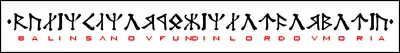 Inscription from The Fellowship of the Ring, written in English using Tolkien's Angerthas Erebor script, in which the rune based on othala represents a "u" sound. It reads left-to-right: "Balin sʌn ov Fu[nd]in lord ov Moria"
