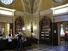 The premises on the Via della Scala in Florence house several historic sales rooms, a tea room, and a museum and library dedicated to the history of the pharmacy. An average of 2,000 visitors per day visit the shop. The main sales room occupies a former chapel, with allegorical frescoes of the four continents painted by Paolino Sarti decorating the vaulted ceilings. The old sacristy is decorated with frescoes by the early-Renaissance artist Mariotto di Nardo, painted in 1380.[3] The Green Room houses displays of wax products, room fragrances, accessories, and men's grooming products. The Old Pharmacy (Antica Spezieria) displays the full range of medicaments and elixirs, foods including biscuits, chocolate, tea, and honey, and the pharmacy's famous liqueurs like Alchermes and Liquore Mediceo.[4] The museum and its exhibits are housed in the Old Laboratories of the Via della Scala premises, containing ceramic and earthenware jars from the 16th and 17th centuries, historic soap machines, and traditional tools. The library is housed in the old sacristy of the church, and includes medieval recipe and reference books.