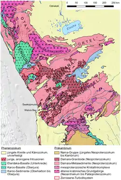 Geologic map of Namibia with the Omingonde Formation partly cropping out in the north-central area (orange)
