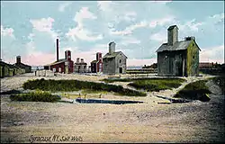 The Solvay Process Company, incorporated in 1881,[20] began drilling deep test holes in the area south of Syracuse in 1883. The company's main product was soda ash, integral to several industries. Eventually Solvay found halite deposits at a depth of 1,216 feet (371 m) below land surface in the southern end of Tully Valley. From 1890 to 1986, more than 120 wells were drilled into four halite beds on the east and west flanks of the valley.[16] Soda ash production began in 1884. The company was producing about 20 tons of soda ash per day, dumping most of its waste material directly into Onondaga Lake.[20] Eventually wastebeds were built along the southwest perimeter of the lake to contain the by-products of soda ash production.[8] In 1907, the New York State Attorney General threatened the Solvay Process Company with legal action over the direct discharge of Solvay waste material into the lake.[20]