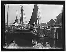 On 18 March 1872 at 6 AM the Boeier (a traditional yacht) Ondine of Mr. Coers was the first vessel to pass the Oranje Locks.[42] In May 1872 2,792 vessels passed the locks, i.e.: 5 barques, 12 brigs, 35 schooners, 16 koffs, 40 steam paddle ships, 133 steam screw ships, 2,222 single-masted sailing vessels or barges, and 329 other vessels.[43] In June 6,758 vessels used the locks, in July 9,631, in August 12,218, in September 10,811. On 4 June 1872, the dike through the IJ was closed, meaning the last section rose above the water level.[44] The hurry with regard to the locks, and the closure of the dike south of it, was also caused by a contractual obligation to close the IJ by 1 November 1872.