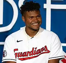 The Guardians selected González's contract on May 26, 2022.[7] He made his major league debut that same day, starting in right field versus the Detroit Tigers at Comerica Park. He singled on a line drive to center field off starting pitcher Tarik Skubal in the top of the second his for the first hit. In the ninth inning, he hit his first major league double.[8] On June 10, 2022, versus the Oakland Athletics, González achieved his first major league four-hit game.[9] González became the Guardians' starting right fielder by the end of the regular season.[10] His walk-up song is the SpongeBob SquarePants theme song, chosen because "deep inside I feel like a kid".[11] On June 19, González hit his first career home run off of Los Angeles Dodgers starter Andrew Heaney.[12]