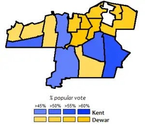 Dewar was re-elected, thanks to support from the city's urban wards, plus her home region in the suburban west and the Francophone east end of the city. She won 10 of the city's 15 wards, with her strongest support in the city's core, where she won over 60% of the vote in three wards: St. George's (63.7%), Wellington (63.2%) and Capital (61.6%). Kent was the strongest in the city's suburban south end, doing his best in his home ward of Canterbury, where he won 59% of the vote.